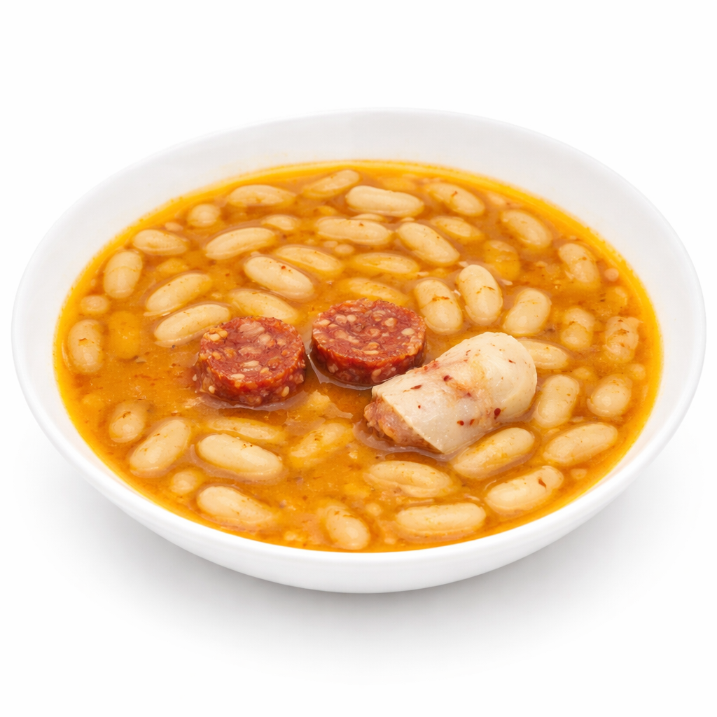 Ingredientes: Alubias blancas, panceta ibérica, chorizo de jabugo, aceite de oliva virgen, tomate, cebolla, harina de trigo, pimentón, ajo, sal, pimienta y agua de salsa.